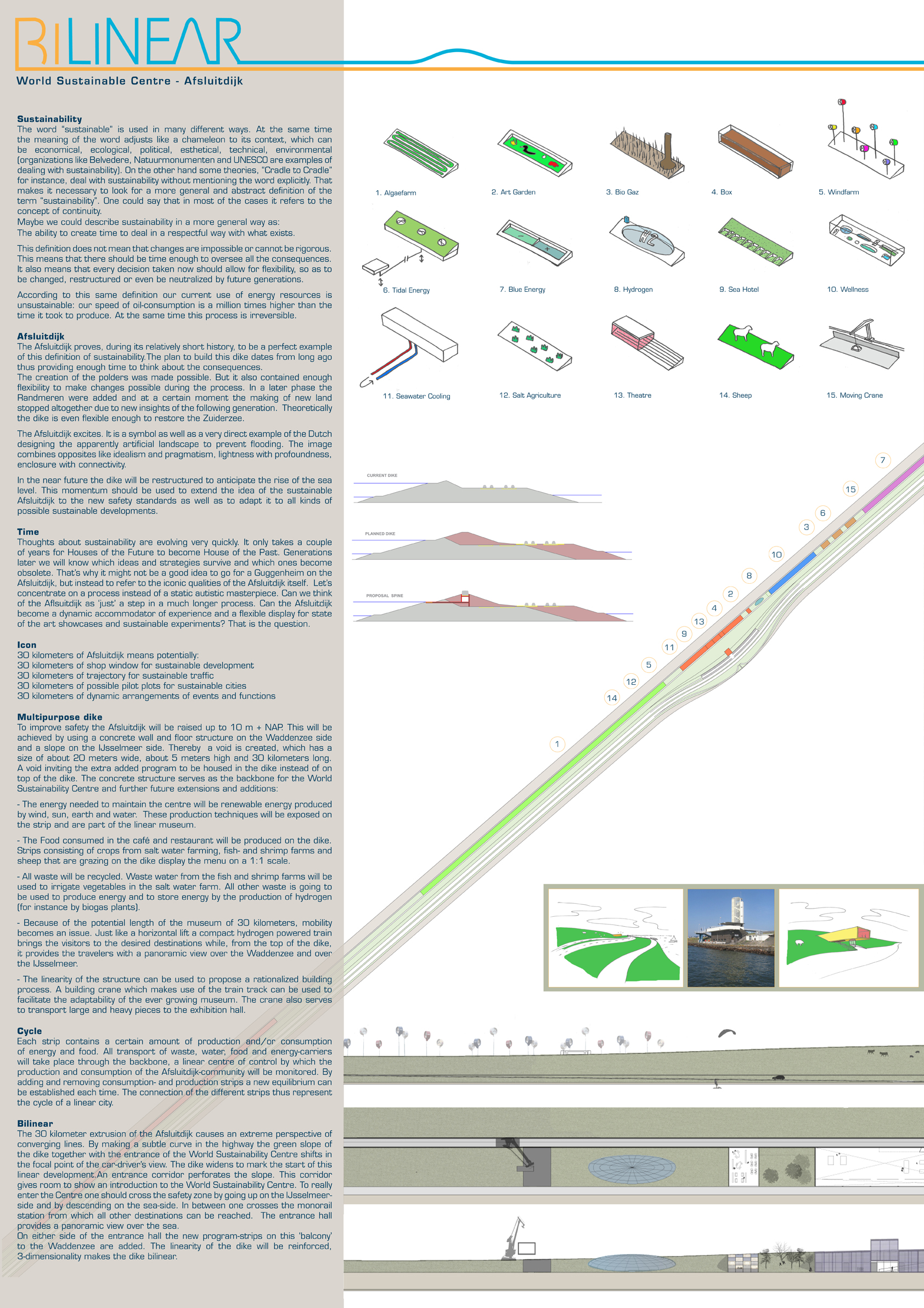 Binnen die vergelijking kan de afsluitdijk gebruikt worden als drager van duurzaamheid door er elementen aan toe te voegen, en zonder het zichzelf te laten verliezen, langzaam maar zeker, generatie na generatie, een staalkaart door de tijd heen te laten worden van duurzaam denken in Nederland.
